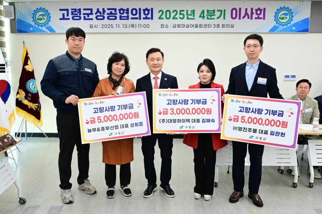 고령군 상공협의회(회장 김종태)는 지난 13일 금빛마실어울림센터에서 열린 4분기 이사회에서 총 1300만원 규모의 고향사랑기부금 기탁식을 진행했다.