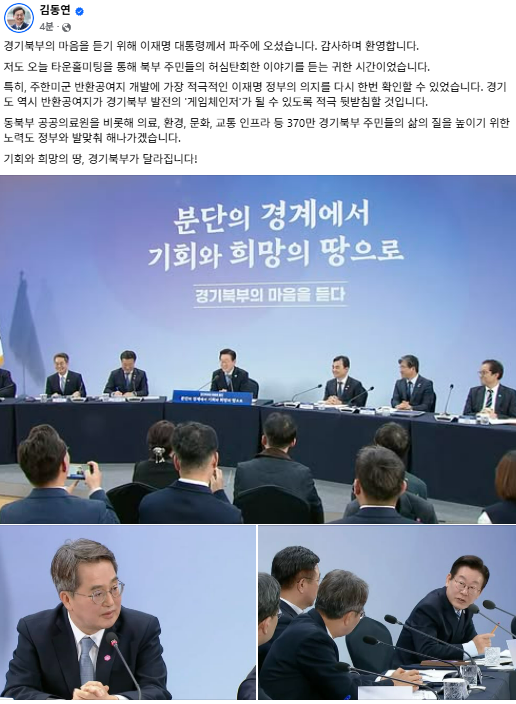 김동연 지사는 이날 자신의 사회관계망서비스(SNS)에 올린 글에서 "경기 북부의 마음을 듣기 위해 이재명 대통령께서 파주에 오셨다"며 "감사하며 환영한다"고 밝혔다.