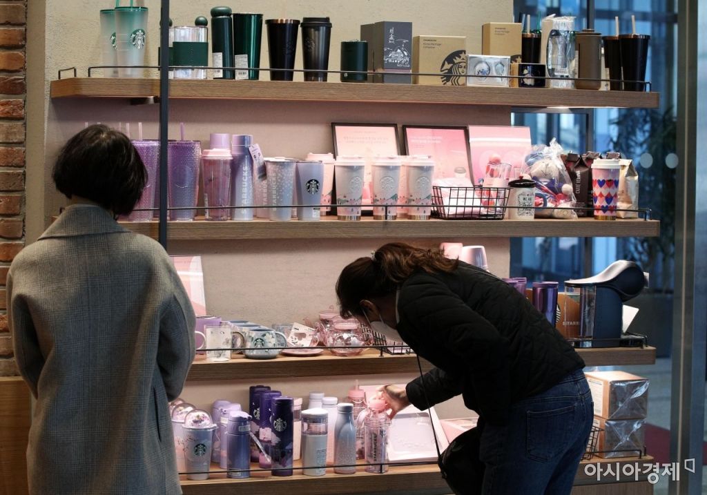 프랜차이즈 커피 매장에서 이용객들이 텀블러를 고르고 있다(기사 이해를 돕기 위한 사진으로 기사 내용과 무관). 김현민 기자 kimhyun81@