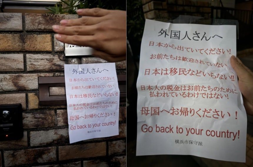 사진 속 쪽지에는 "일본은 이민자를 원하지 않는다", "일본인의 세금은 외국인에게 쓰이는 것이 아니다"라는 문구가 적혀 있었다. 영어로 "Go back to your country(네 나라로 돌아가라)"는 표현까지 적혀 있었으며, 발신자 명칭에는 '요코하마시 보수파'라는 이름이 기재돼 있었다. 집 앞과 차량 옆에는 "이민 STOP", "일본을 무너뜨리는 이민 정책 반대"라는 문구가 적힌 포스터도 추가로 붙어 있었다.