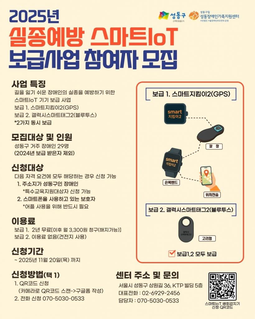 성동구는 2020년부터 2024년까지 총 237대의 스마트IoT 기기를 지역 내 장애인에게 보급하며 실종 예방에 힘써왔다. 올해는 블루투스 기반의 위치 추적 기기 ‘갤럭시 스마트태그2’도 함께 보급해 발달장애인 실종 예방 지원을 한층 강화했다. 보급된 기기는 2년간 무료로 이용할 수 있으며, 이후에는 월 3300원을 부담하면 계속 사용할 수 있다.