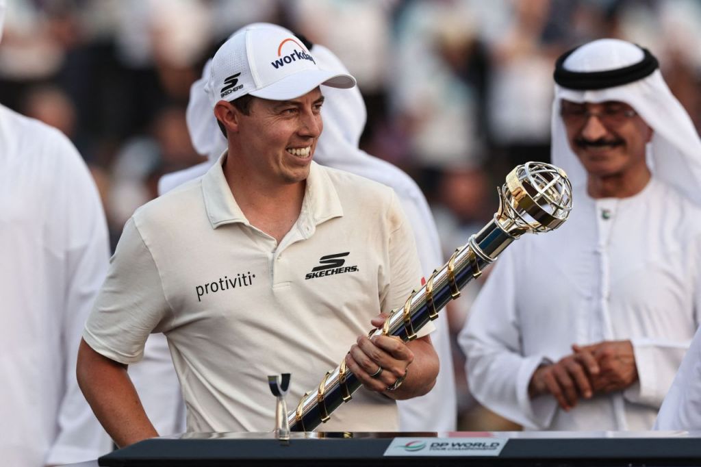 매트 피츠패트릭이 DP월드투어 최종전인 투어 챔피언십 우승 직후 트로피를 들고 환하고 웃고 있다. 두바이=AFP연합뉴스