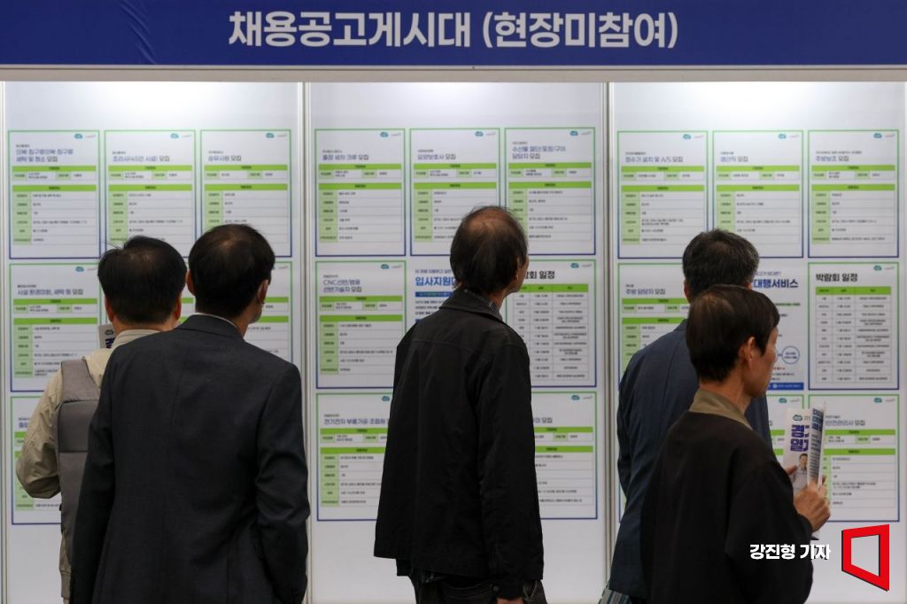 지난달 경기 고양 킨텍스에서 열린 '경기도 5070 일자리 박람회'에 참가한 구직자들이 채용 게시판을 보고 있다.