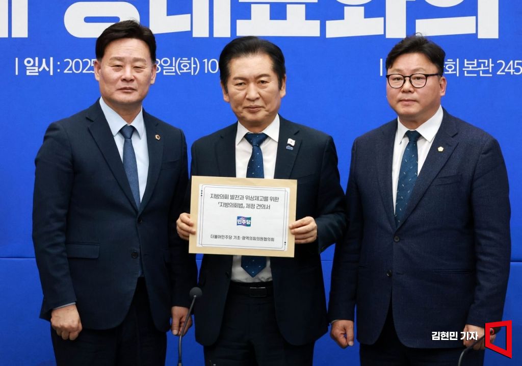정청래 더불어민주당 대표가 18일 국회에서 열린 전국기초·광역의회의원협의회 간담회에서 지방의회 의원 협의회 대표들에게 지방의회 발전과 위상제고를 위한 지방의회법 제정 건의서를 받은 뒤 들어 보이고 있다. 왼쪽부터 민주당 최종현 전국광역의회의원협의회 대표, 정 대표, 박열완 전국기초의회의원협의회 대표.