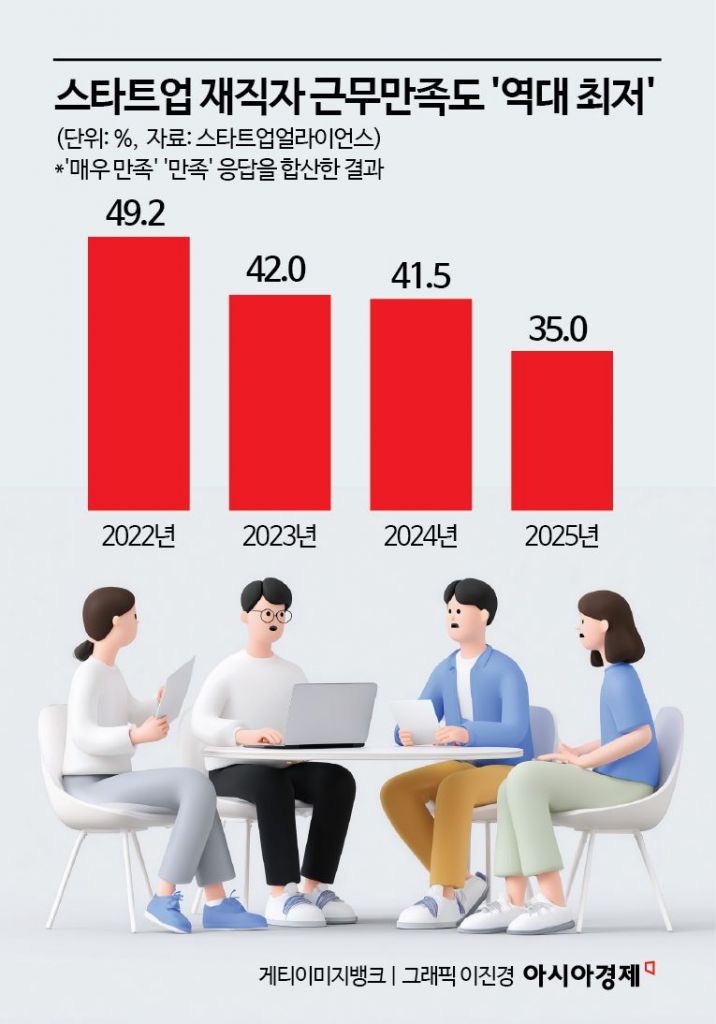 18일 스타트업얼라이언스와 오픈서베이가 발표한 '스타트업 트렌드리포트 2025'에 따르면 스타트업 재직자의 근무 만족도는 전년 대비 6.5%포인트 떨어진 35%로 집계됐다. 2022년 49.2%, 2023년 42.0%에 이어 3년 연속 내림세다. 대기업 재직자의 근무 만족도(66.5%)와는 큰 격차를 보였다.