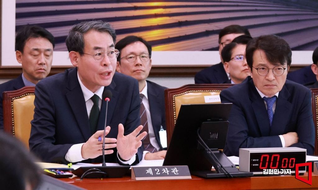 강희업 국토교통부 2차관이 18일 국회에서 열린 국토교통위원회 전체회의에서 위원 질의에 답하고 있다. 오른쪽은 김의겸 새만금개발청장,
