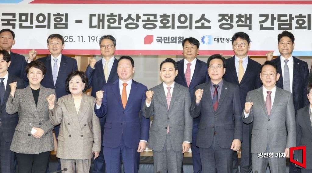 장동혁 국민의힘 대표와 최태원 대한상공회의소 회장이 19일 서울 중구 대한상공회의소에서 열린 '국민의힘-대한상공회의소 정책간담회'에 참석해 기념촬영을 하고 있다.
