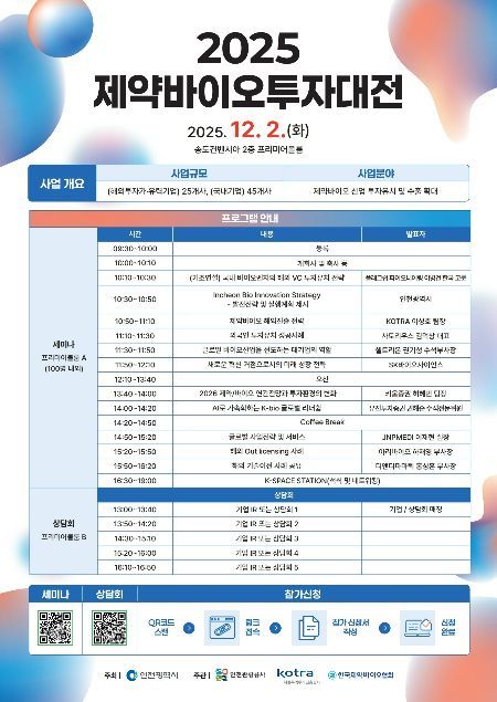 인천광역시가 주최하고 한국제약바이오협회, 인천관광공사, 대한무역투자진흥공사(KOTRA)가 공동 주관하는 '2025 제약바이오투자대전'이 내달 2일 인천 연수구 송도컨벤시아 프리미어볼룸에서 열린다.