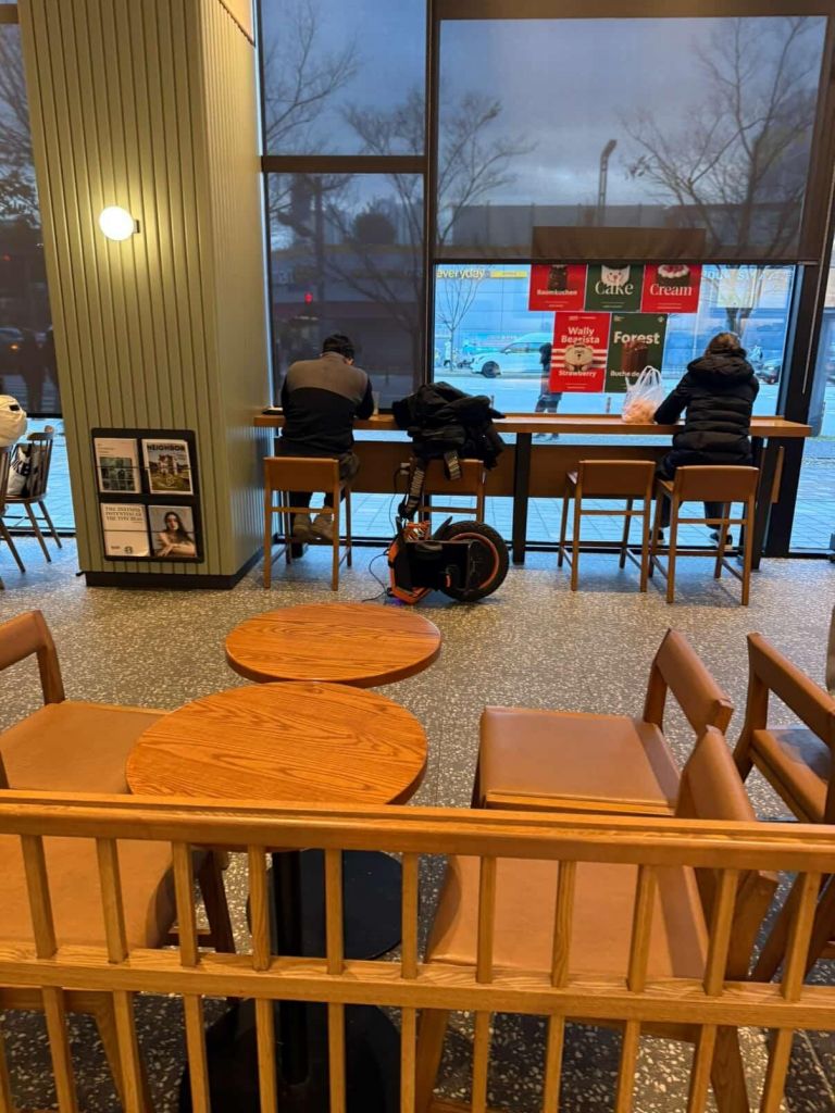 한 스타벅스 이용객이 자리에서 전동휠을 충전하고 있다. 온라인 커뮤니티