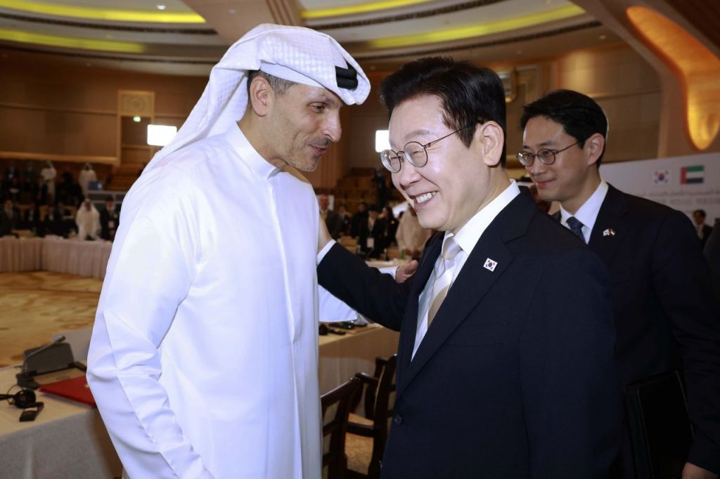 아랍에미리트(UAE)를 국빈 방문 중인 이재명 대통령이 19일(현지시간) 아부다비의 한 호텔에서 열린 한-UAE 비즈니스 라운드테이블에서 칼둔 칼리파 알 무바라크 아부다비 행정청장과 인사하고 있다. 연합뉴스