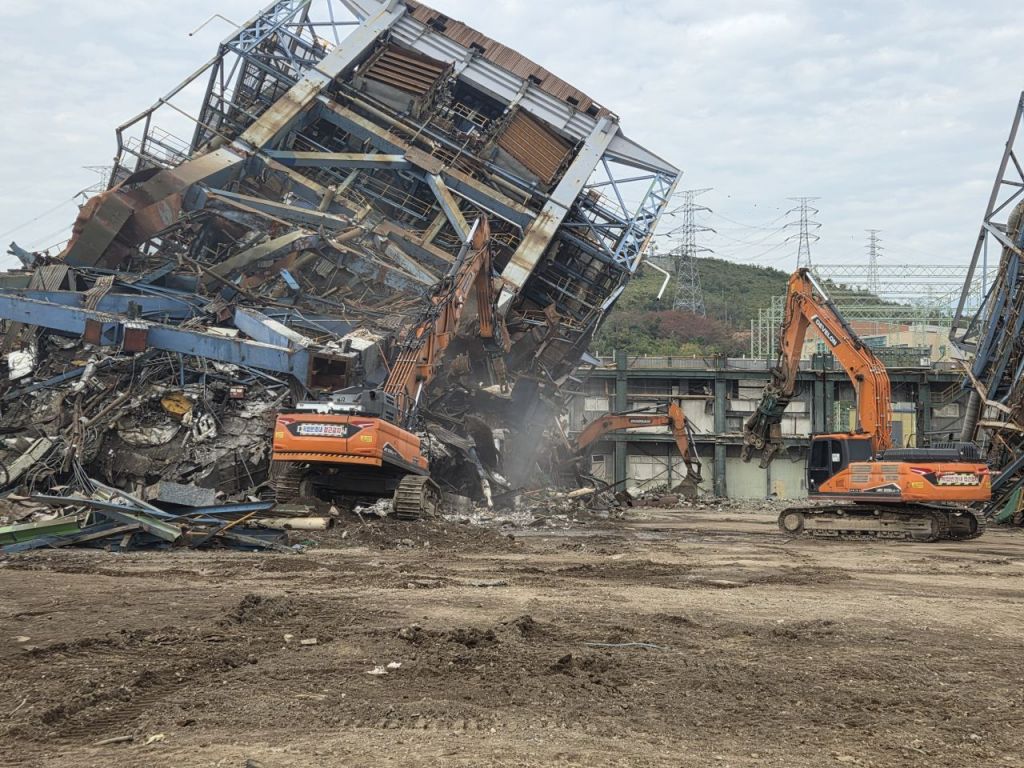 지난 13일 울산화력발전소 보일러 타워 붕괴 사고 현장에서 마지막 매몰자를 찾기 위해 중장비가 동원돼 보일러 타워 구조물들을 해체하고 있는 모습. 연합뉴스