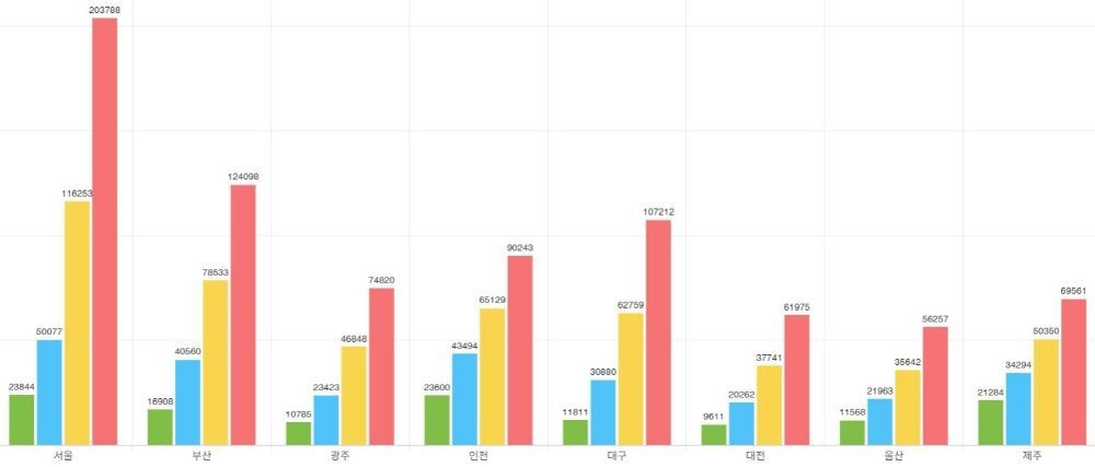 전국 매매금액 총액은 1천3백조 서울시가 1위로 440조 2위는 경기도가 270조, 17위 최하위는 세종시가 5.2조로 나타났다. 전국 빌딩매매, 건물매매, 꼬마빌딩 1채당 평균 매매가격은 4.3억, 서울시 22억 1위 인천이 5.9억으로 2위 최하위 17위는 전라남도가 평균 8.2천만원으로 조사됐다.