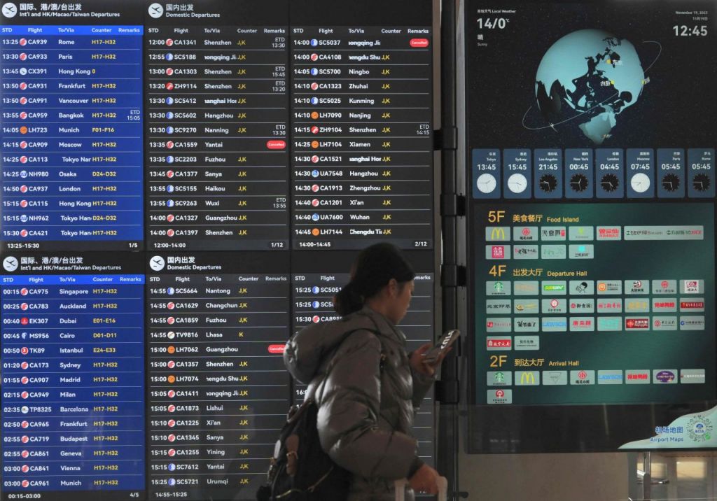 베이징 국제공항에서 일본행 항공편을 포함한 국제선 항공편 안내판을 지나가는 승객 모습. 연합뉴스AFP