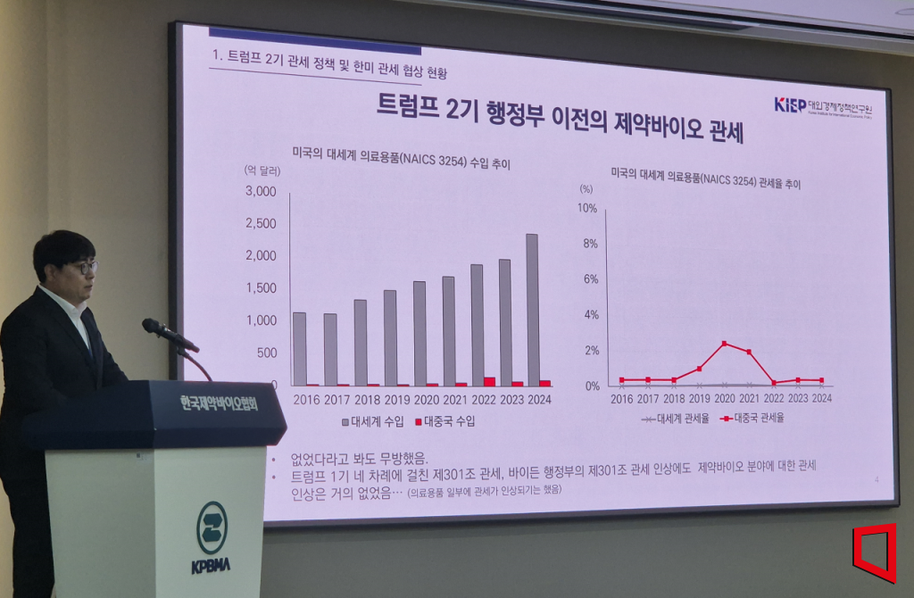 김 위원은 트럼프 2기 행정부 통상 정책의 핵심 위험요소로 '무역확장법 232조'를 짚었다. 과거 미국은 중국 등 여러 국가에 관세 조처를 하면서도, 제약·바이오 분야만큼은 3% 미만 혹은 0% 수준의 관세를 유지해 온 바 있다. 하지만 이제 관세 부과 우려를 외면할 수 없다는 주장이다.