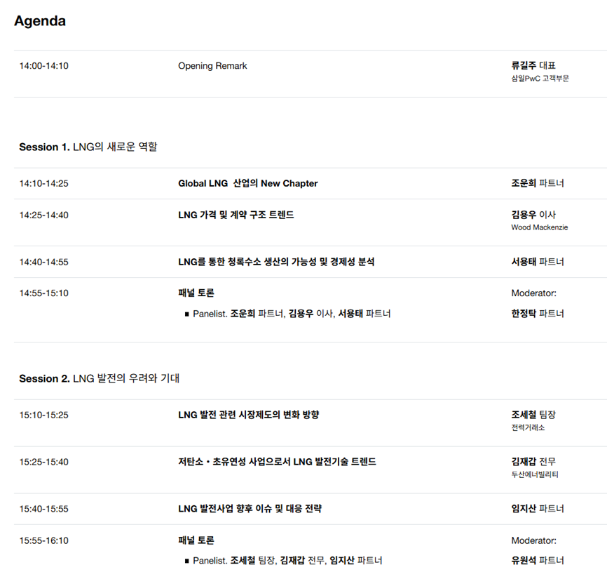 첫 번째 세션에선 조운희 PwC컨설팅 파트너가 '글로벌 LNG 산업 트렌드 전망'을 주제로 재생에너지 선진국의 LNG발전 수익모델을 발표한다. 또한 김용우 우드맥킨지 이사가 'LNG 가격 및 계약 구조 트렌드'를 주제로, 서용태 삼일PwC 파트너가 'LNG를 통한 청록수소 생산의 가능성 및 경제성 분석'을 주제로 각각 발표한다.