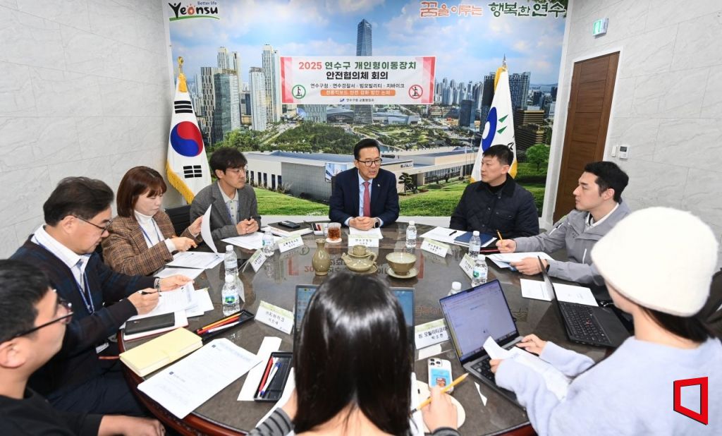 이재호 인천 연수구청장(가운데)이 지난 21일 '개인형 이동장치 교통안전협의체 실무회의'에서 전동킥보드 안전사고 예방책에 대해 논의하고 있다. 인천 연수구