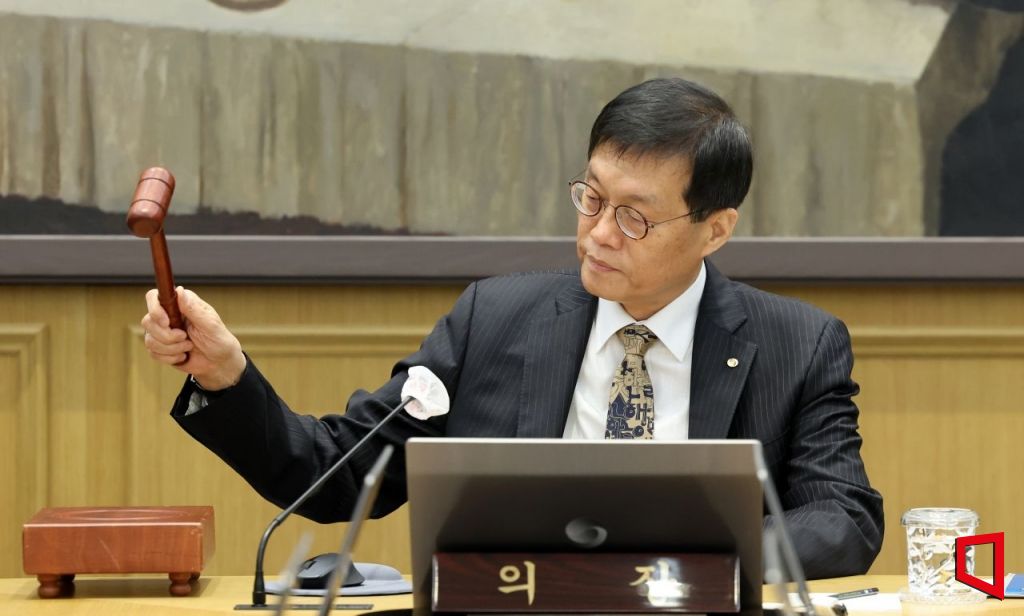 이창용 한국은행 총재가 27일 서울 중구 한국은행 본관에서 열린 금융통화위원회 본회의에서 의사봉을 두드리고 있다. 연합뉴스