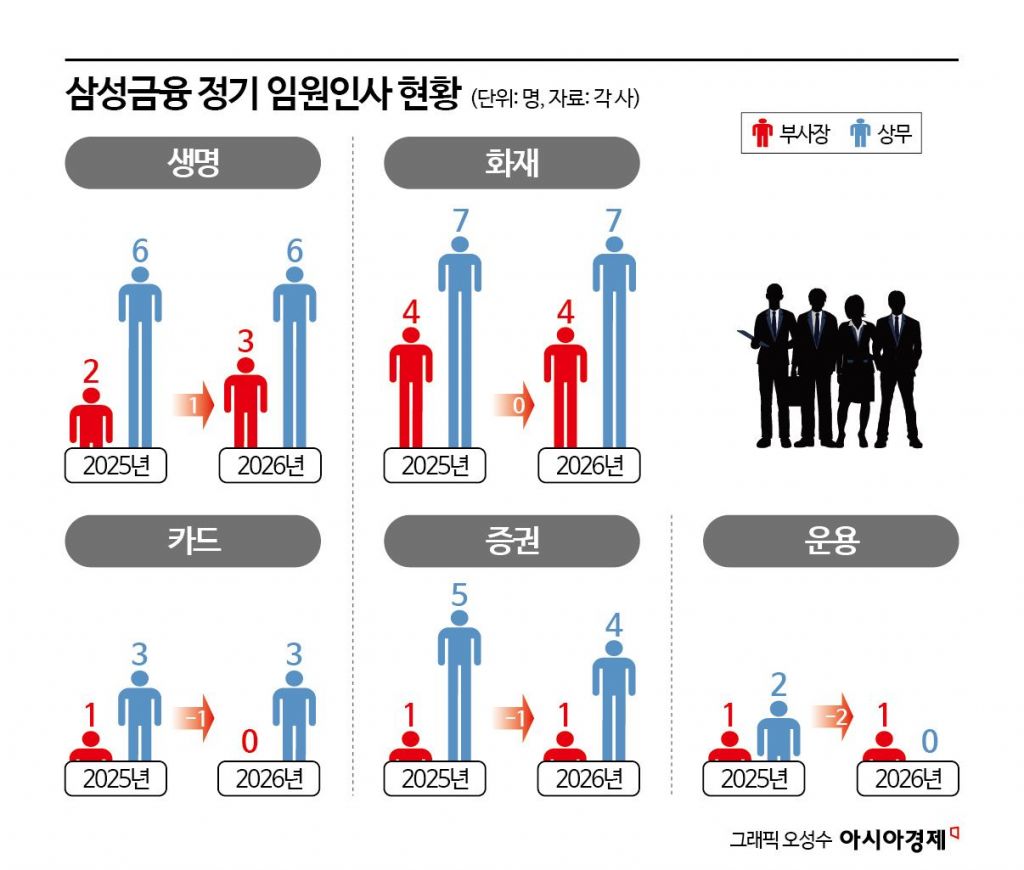 27일 금융권에 따르면 삼성금융은 전날 일제히 '2026년도 정기 임원인사'를 단행했다. 부사장 9명과 상무 20명 등 총 29명의 승진자가 발표됐다. 지난해보다는 승진자가 3명 줄었다.
