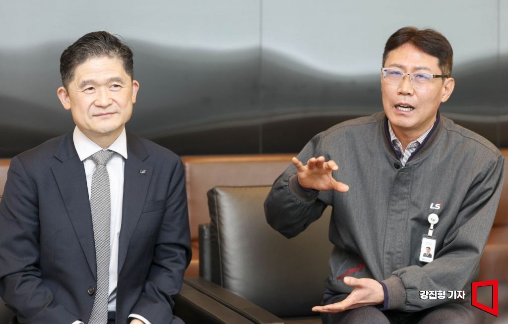 배채윤 LS일렉트릭 선행기술연구단장(왼쪽)과 문상천 LS일렉트릭 천안사업장 공장장이 20일 충남 LS일렉트릭 천안DC팩토리에서 인터뷰 하고 있다. 강진형 기자