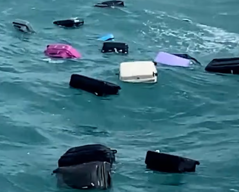 영상에는 여행 가방과 배낭 여러 개가 바다 위에 떠 있는 모습이 담겼다. 잠파렐리는 자막에 "무능한 승무원 때문에 모든 짐을 잃었다"고 적었다.
