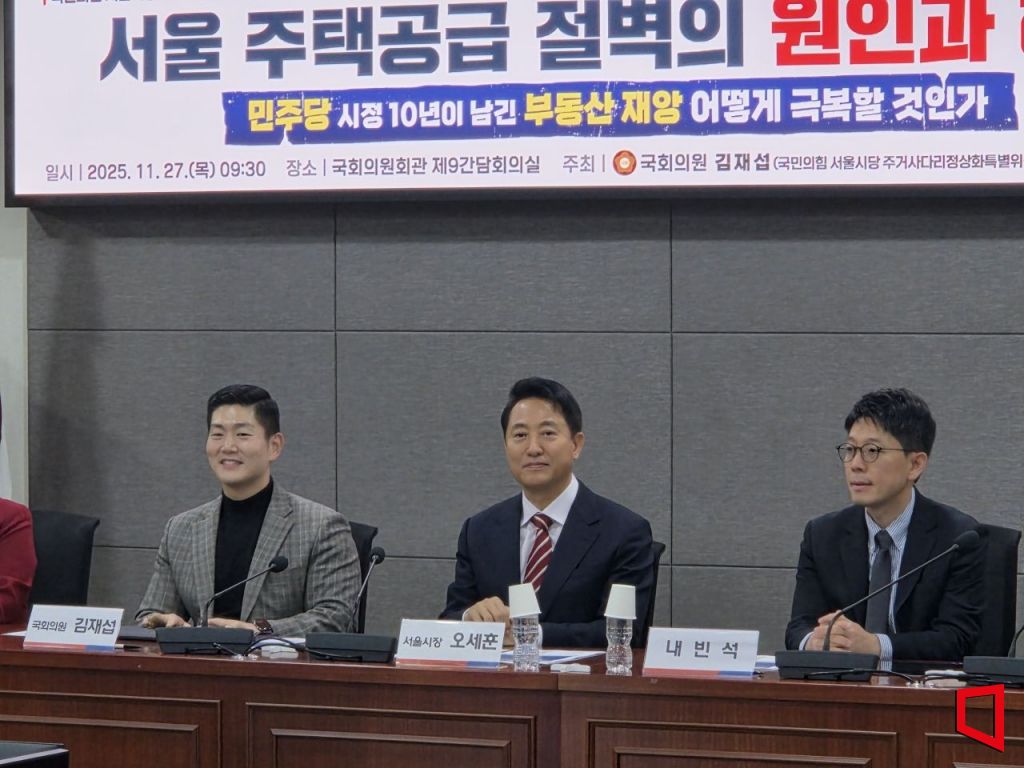왼쪽부터 김재섭 국민의힘 의원, 오세훈 서울시장, 김병민 서울시 정무부시장이 27일 열린 '서울 주택공급 절벽의 원인과 해법' 토론회에 참석해 발언을 듣고 있다. 이정윤 기자
