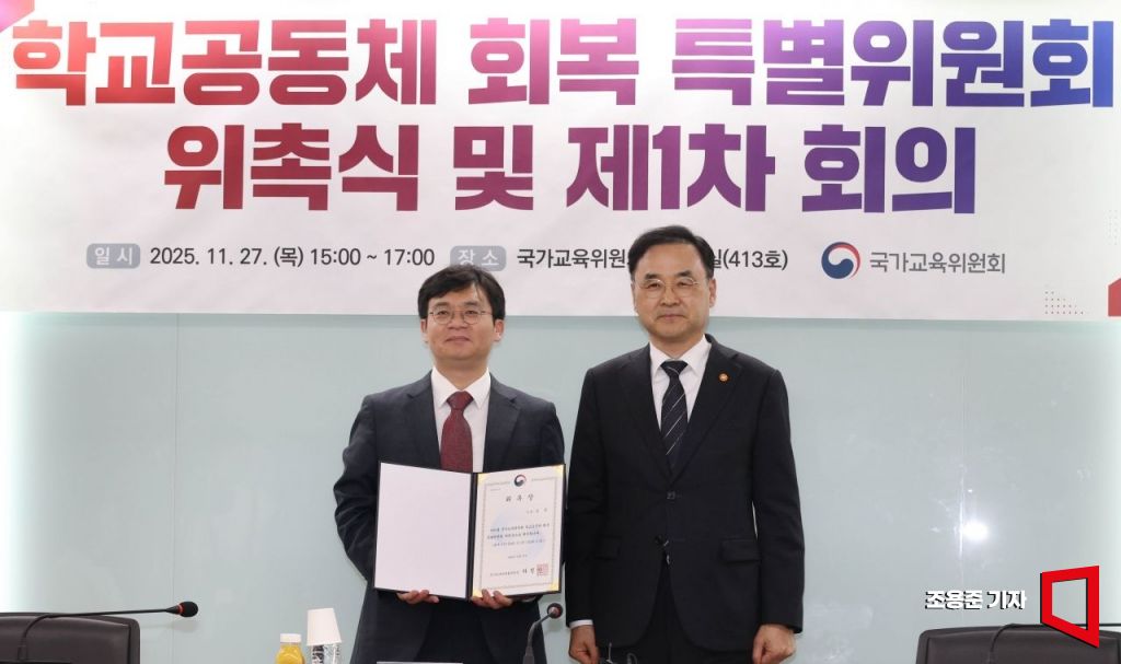 차정인 국가교육위원장(오른쪽)이 27일 서울 종로구 정부서울청사에서 열린 제1차 학교공동체 회복 특별위원회에서 김용 특위위원장에게 위촉장을 수여하고 기념촬영을 하고 있다.