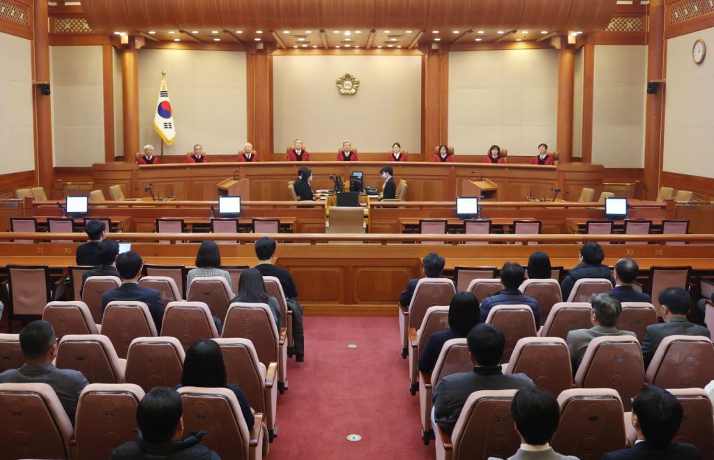 김상환 헌법재판소장 등이 27일 서울 종로구 헌재 대심판정에서 11월 심판사건 선고를 앞두고 자리에 앉아 있다. 연합뉴스