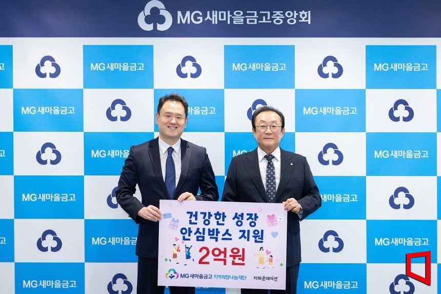 김인 새마을금고 지역희망나눔재단 이사장(오른쪽)과 박충관 국제개발협력 NGO 지파운데이션 대표(왼쪽)가 서울 강남구 새마을금고중앙회에서 열린 안심박스 지원사업 기념식(2025.5.28.)에서 기부금을 전달하고 사진촬영을 하고 있다.