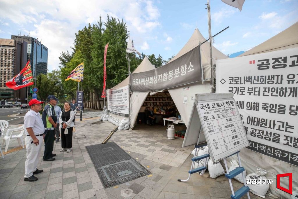 서울 중구가 코로나19 백신 희생자 합동 분향소 철거 행정 집행을 밝힌 가운데 3일 서울 중구 서울시의회 앞에 마련된 코로나19 백신 희생자 합동 분향소에서 관계자들이 분향소를 지키고 있다. 사진=강진형 기자aymsdream@