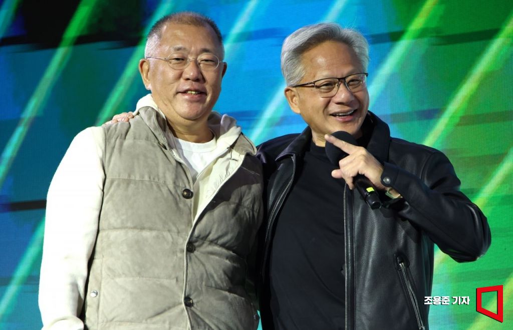 젠슨 황 엔비디아 CEO가 지난 10월 30일 밤 서울 강남구 코엑스광장에서 지포스(GeForce) 한국 25주년을 기념해 열린 '지포스 게이머 페스티벌'에 정의선 현대차그룹 회장과 함께 올라 인사를 하고 있다. 2025.10.30 조용준 기자