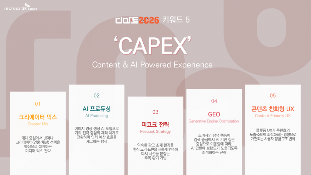 'CAPEX'는 콘텐츠와 AI 기술이 결합해 디지털 마케팅 경험을 근본적으로 혁신한다는 의미를 담고 있다. 인크로스는 ▲크리에이터 믹스(Creator Mix) ▲AI 프로듀싱(AI Producing) ▲피코크 전략(Peacock Strategy) ▲GEO(Generate Engine Optimization) ▲콘텐츠 친화형 UX(Content-friendly UX)의 영문 글자를 조합해 핵심 키워드를 도출했다.