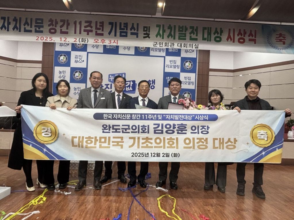 완도군의회 김양훈 의장이 한국자치신문 창간 11주년을 맞아 열린 '자치발전 대상 시상식'에서 '기초의회 의정 대상'을 수상했다.