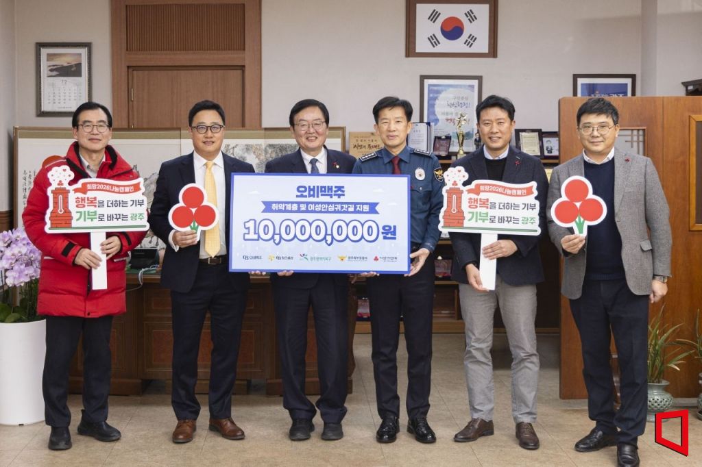 3일 광주 북구청에서 열린 ‘음주운전 없는 안전 귀가’ 민·관·경 합동 캠페인에서 오비맥주가 광주 북부 여성안심귀갓길 지원 사업 등에 쓰일 기부금을 전달하고 있다. 광주사회복지공동모금회박흥철 사무처장(왼쪽부터), 오비맥주구자범 수석 부사장, 문인 광주북구청장, 김용관 광주북부경찰서장, 오비맥주양우천 광주공장장, 오비맥주 김태호 광주지점장. [사진제공 오비맥주]