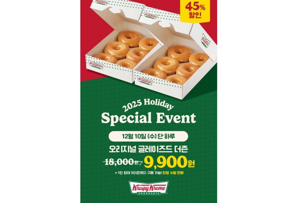 이번 행사는 크리스피크림 도넛의 '오리지널 글레이즈드 더즌'을 정상가 대비 45% 할인된 가격으로 만날 수 있다. 전국 크리스피크림 도넛 매장에서 한정수량 현장 판매되며, 1인당 최대 더즌 5개까지 구매할 수 있다.