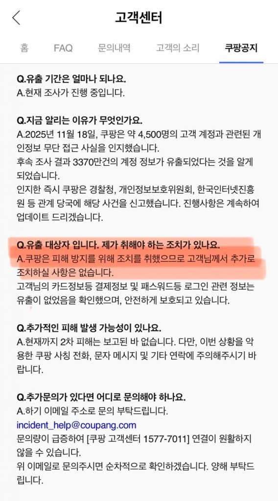 개인정보위는 지난 3일 긴급 전체회의를 열어 쿠팡에 개인정보 '노출' 통지를 '유출'로 수정해 재통지하고, 팝업창 등으로 일정 기간 유출 내용을 공지하며, 추가 피해 예방 요령을 적극 안내할 것을 촉구했다. 또한 자체 모니터링을 강화하고 전담 대응팀을 확대 운영할 것을 명령했다. 이에 쿠팡은 5일 오전 현재 기준으로 홈페이지 고객센터 게시글에 '유출' 표현을 넣었을 뿐 "(피해 방지를 위해) 고객이 추가로 조치할 사항은 없다"며 안일한 태도로 일관하고 있다. 개인정보위 관계자는 아시아경제와의 통화에서 "쿠팡에 7일 이내에 조치결과를 제출하도록 했다"며 "기한 내 이행하지 않으면 법에 따라 사전 통지를 거쳐 시정명령, 과태료 대상이 될 수 있다"고 말했다.