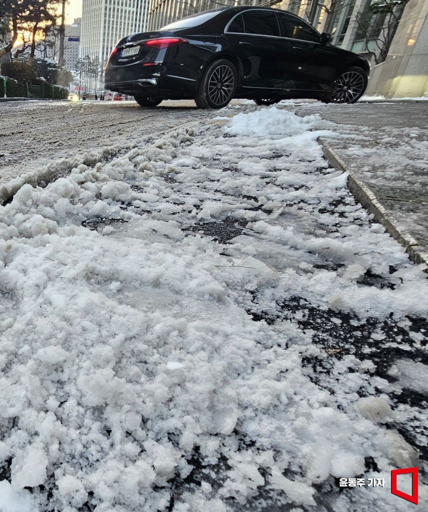 수도권 일대에 전날 내린 폭설이 밤새 영하권 추위에 서울 도심 도로 곳곳이 얼어 붙은 5일 제설작업이 미흡한 서울 중구의 한 이면도로를 지나는 차량들이 서행하고 있다.