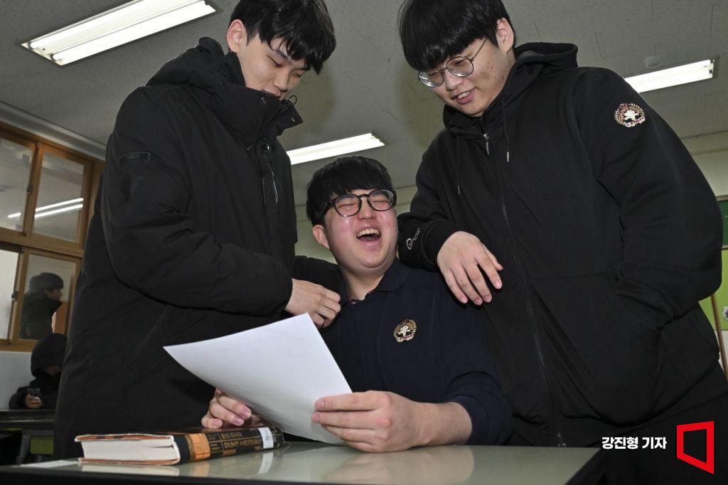 2026학년도 대학수학능력시험 성적표 배부일인 5일 서울 광진구 광남고등학교에서 '수능 만점자' 왕정건 학생이 학우들로부터 축하를 받고 있다.
