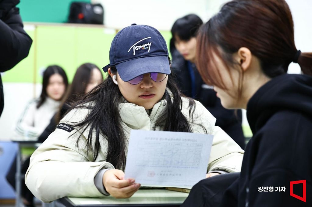 2026학년도 대학수학능력시험 성적표가 배부된 5일 서울 광진구 광남고등학교 3학년 교실에서 수험생들이 성적표를 살펴보고 있다.