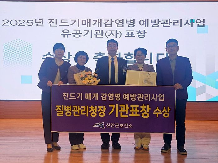 전남 신안군이 질병관리청이 주관한 '2025년 진드기 매개 감염병 예방 관리 사업 평가 대회'에서 우수 지자체로 선정돼 질병관리청장 기관 표창을 받았다.