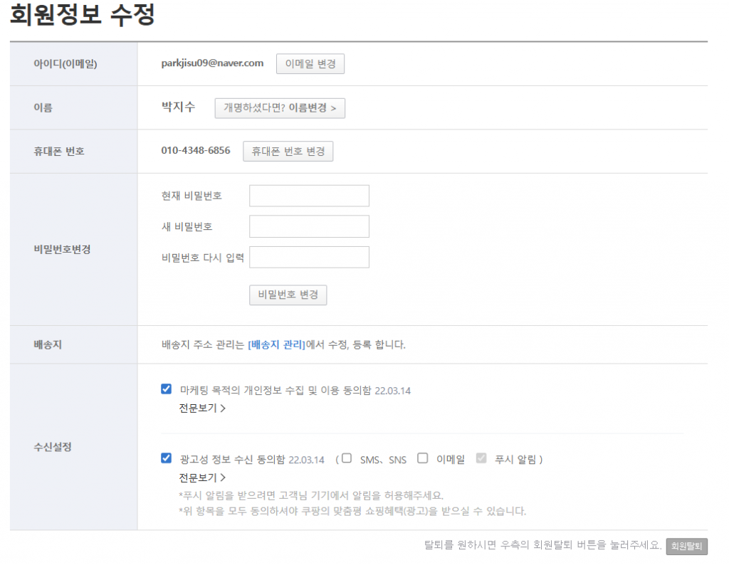 쿠팡의 회원정보 수정 페이지. 쿠팡 캡처