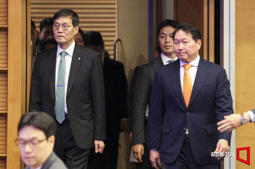 최태원 대한상공회의소 회장(오른쪽)과 이창용 한국은행 총재가 5일 서울 중구 대한상공회의소에서 열린 '제4회 한국은행-대한상공회의소 세미나, AI 기반의 성장과 혁신'에 참석하고 있다.