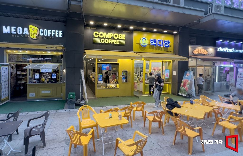 서울 종로구의 한 빌딩에 입주해 있는 국내 저가 커피 브랜드 매장들. 왼쪽부터 메가커피, 컴포즈커피, 빽다방, 하나 건너 더벤티커피. 허영한 기자