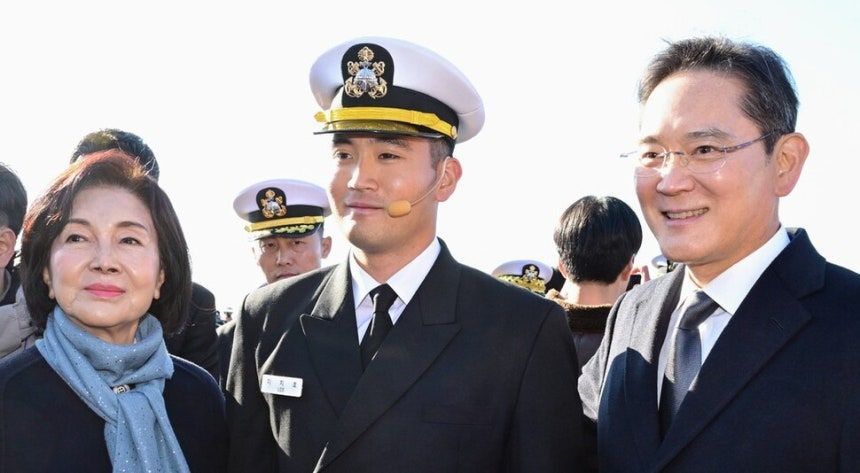 이재용 삼성전자 회장(오른쪽)과 홍라희 리움미술관 명예관장(왼쪽)이 28일 오후 경남 창원시 진해구 해군사관학교 연병장에서 열린 '제139기 해군·해병대 사관후보생 수료 및 임관식'에서 이지호 신임 소위(가운데)와 기념사진을 찍고 있다. 연합뉴스