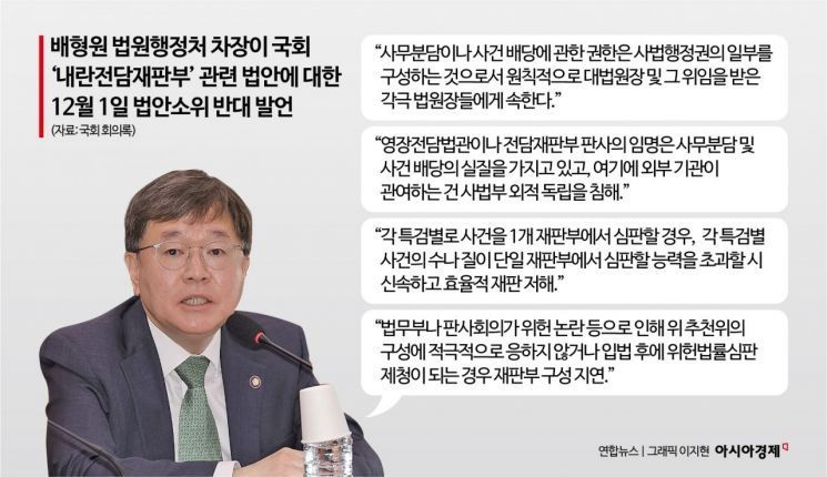 이런 가운데 지난 1일 열린 국회 법안심사제1소위 8차 회의에서는 배형원 대법원 법원행정처 차장이 내란전담재판부 설치안을 두고 "사법행정권 침해", "사법부 외적 독립 훼손"이라며 법안 핵심 조항을 조목조목 반박한 것으로 확인됐다.