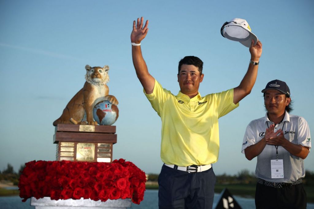 마쓰야마 히데키가 히어로 월드 챌린지 우승 직후 트로피를 앞에 두고 기뻐하고 있다. 바하마=AFP연합뉴스