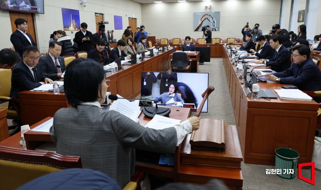 9일 국회에서 열린 과학기술정보방송통신위원회 전체회의에서 최민희 위원장이 의사봉을 두드리고 있다.