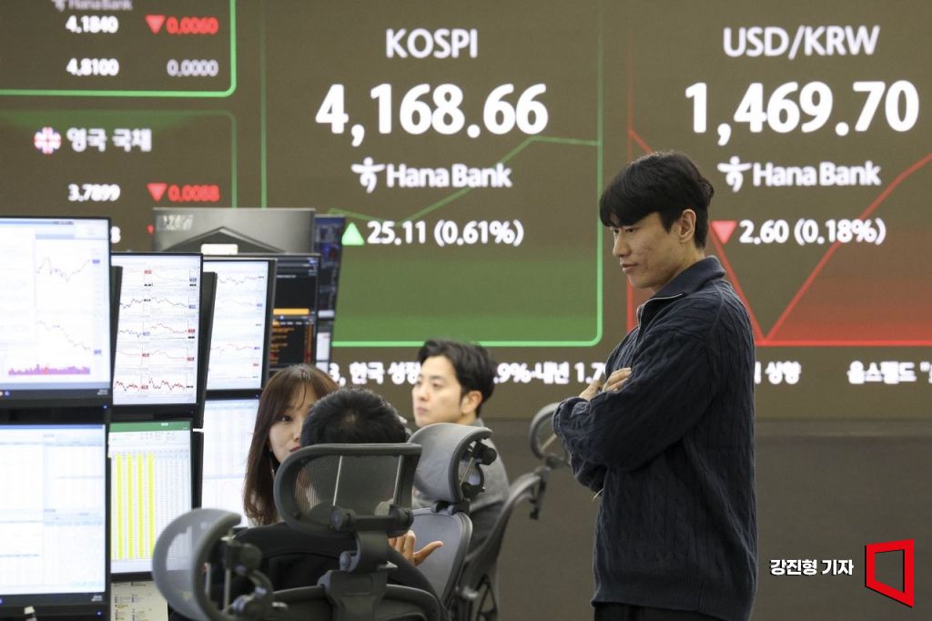 코스피 지수가 전 거래일 대비 15.50포인트 상승한 4159.05로 개장한 10일 서울 중구 하나은행 딜링룸 전광판에 국내 증시 현황이 표시돼 있다. 이날 원달러 환율은 전 거래일 대비 2.3원 하락한 1470원에 거래를 시작했다. 2025.12.10 강진형 기자