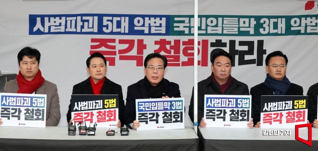 송언석 국민의힘 원내대표가 10일 국회 본청 앞에서 '더불어민주당의 8대 악법' 저지 릴레이 천막농성장에서 발언하고 있다. 국민의힘은 이른바 '8대 악법' 저지 시점까지 농성을 이어갈 방침이다.