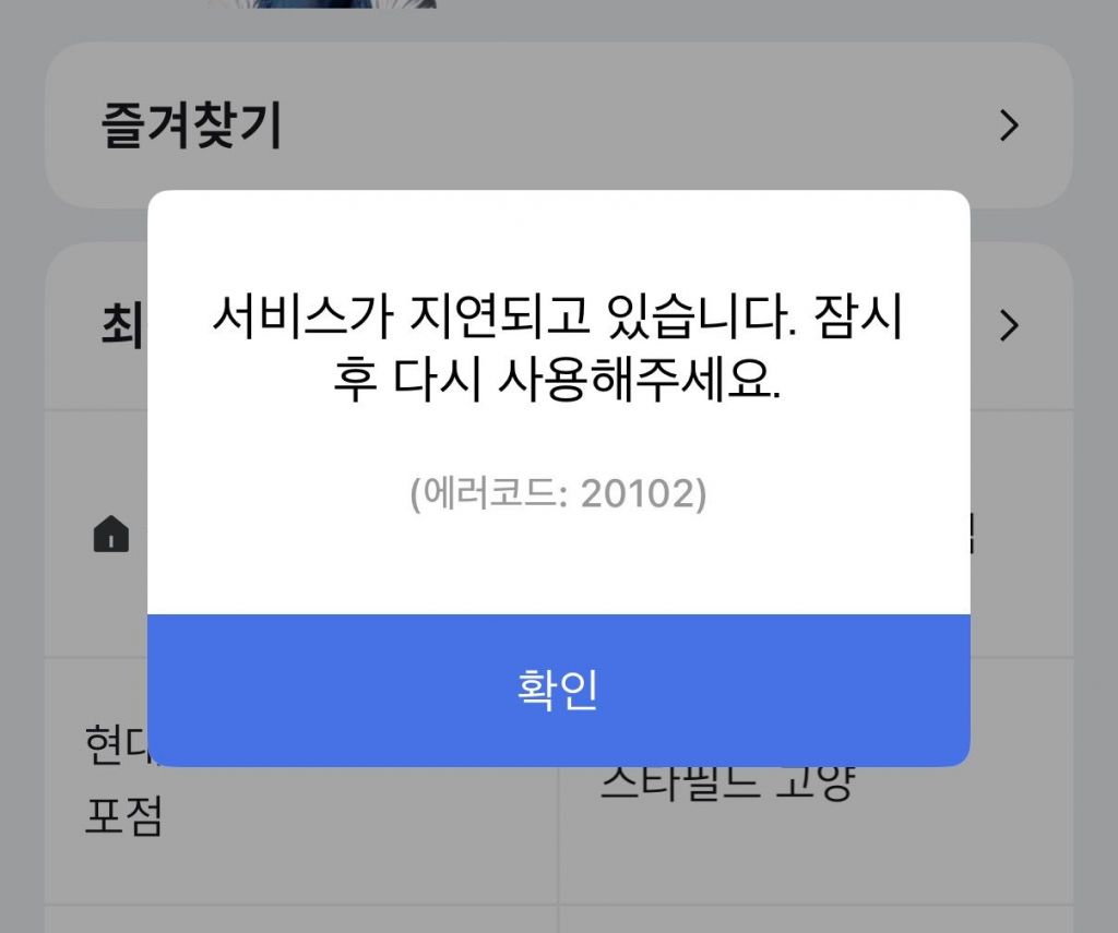 오전 한때 앱을 실행하면 에러 코드와 함께 '서비스가 지연되고 있다. 잠시 후 다시 사용해달라'는 안내 문구가 나온 것으로 알려졌다. 오전 9시50분 현재는 앱 접속까지는 정상적으로 이뤄지지만, 목적지 설정 후 길 안내 요청 시 서비스 지연 안내 문구가 나오고 있다.