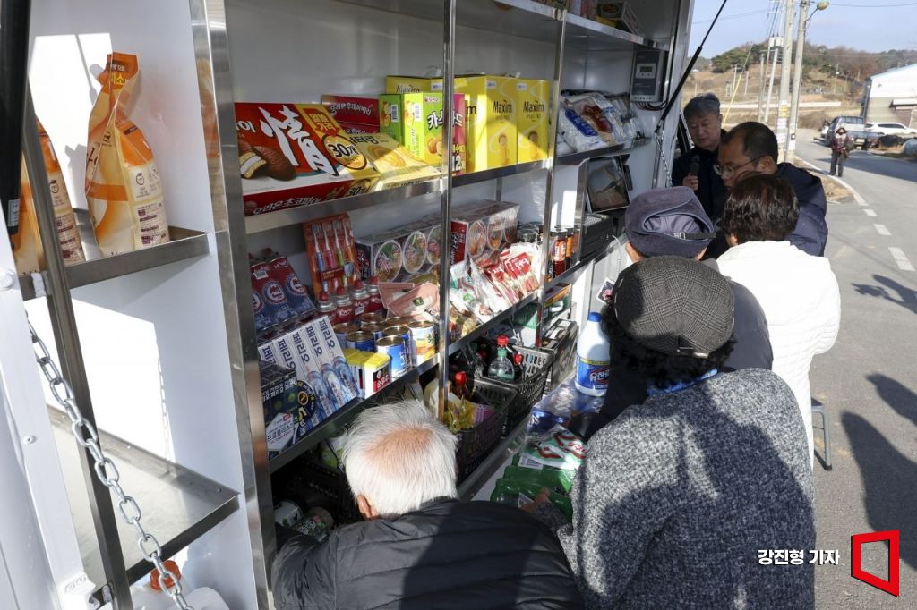 1일 충남 당진 합덕읍 도곡1리마을회관에 마련된 가가호호 찾아가는 당진농촌이동장터를 찾은 주민들이 물품을 구매하고 있다. 강진형 기자